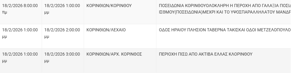 Από τον ΔΕΔΔΗΕ Κορίνθου αναφέρεται: «Λόγω εργασιών συντήρησης του Δικτύου του ΔΕΔΔΗΕ θα πραγματοποιηθεί διακοπή ηλεκτροδότησης στις παρακάτω περιοχές: