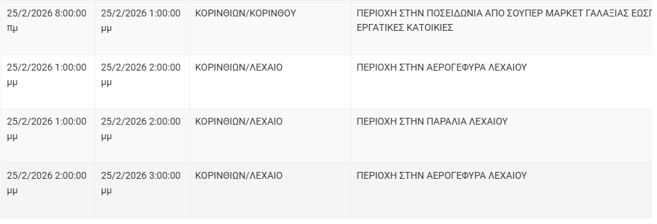 Από τον ΔΕΔΔΗΕ Κορίνθου αναφέρεται: «Λόγω εργασιών συντήρησης του Δικτύου του ΔΕΔΔΗΕ θα πραγματοποιηθεί διακοπή ηλεκτροδότησης στις παρακάτω περιοχές: