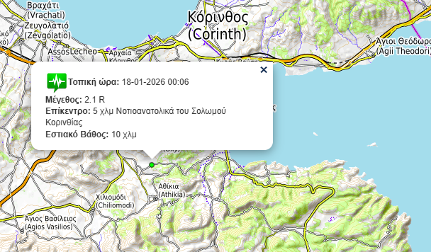 Κοινωνικά ΚΟΡΙΝΘΟΣ: Σεισμική δόνηση κοντά στο Σολωμό(φωτο) 19 Ιανουαρίου, 2026 FacebookTwitterPinterestWhatsApp Ασθενής σεισμική δόνηση 2,1 Ρίχτερ σημειώθηκε την Κυριακή τα ξημερώματα κοντά στο Σολωμό Κορινθίας Το επίκεντρο του σεισμού: Κ.Ν