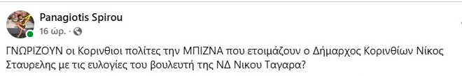 Μία ανάρτηση του δημοτικού συμβούλου της “Πράσινης Πόλης” στο δήμο Κορινθίων Π. Σπύρου δημιουργησε πολλά ερωτηματικά πριν από λίγες ώρες αναφέροντας: “Γνωρίζουν οι Κορίνθιοι πολίτες την ΜΠΙΖΝΑ που ετοιμάζουν ο δήμαρχος Κορινθίων Ν. Σταυρέλης με τις ευλογίες του βουλευτή της ΝΔ Ν. Ταγαρά;“