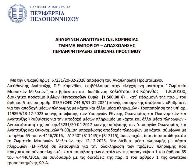 ΚοινωνικάΠΡΩΤΟΣΕΛΙΔΑ ΚΟΡΙΝΘΟΣ: Το πρόστιμο των 1.500 ευρώ στο σωματείο… 26 Φεβρουαρίου, 2026 FacebookTwitterPinterestWhatsApp Η αναρτημένη απόφαση: