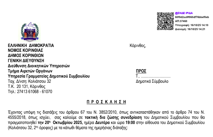 Η πρόσκληση στους δημοτικούς συμβούλους: