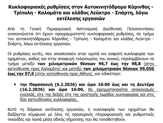 Κοινωνικά Κυκλοφοριακές ρυθμίσεις στον αυτοκινητόδρομο Κόρινθος -Τρίπολη – Καλαμάτα 4 Φεβρουαρίου, 2026 FacebookTwitterPinterestWhatsApp Η ανακοίνωση από την αστυνομία: