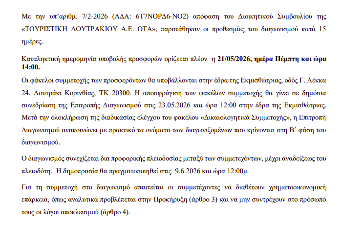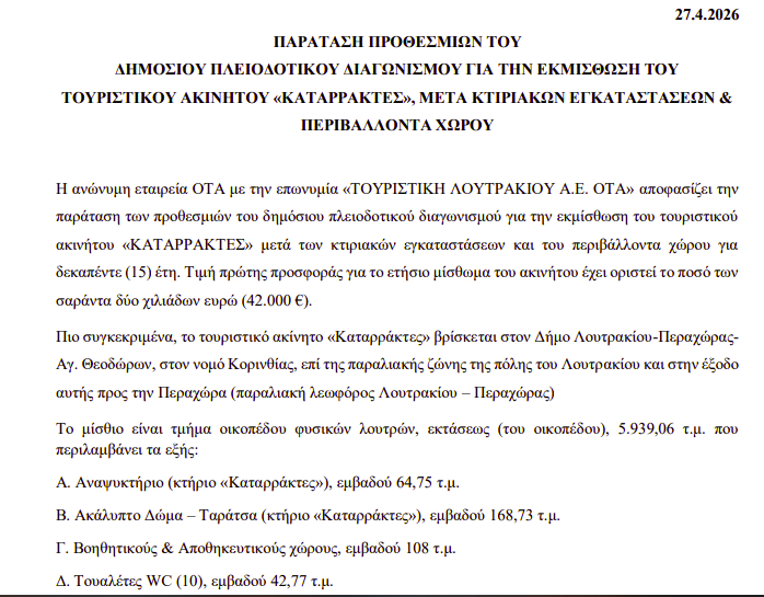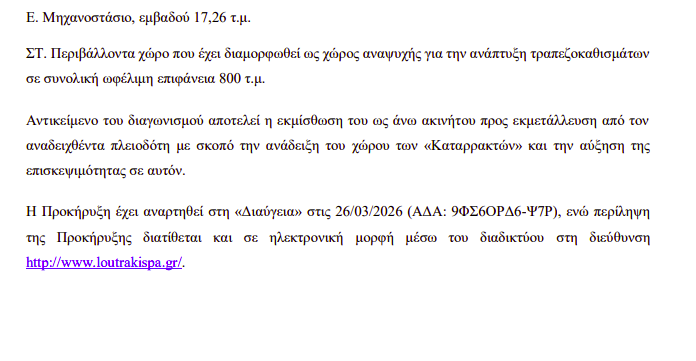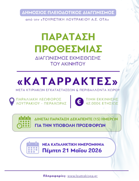 ΚοινωνικάΠΡΩΤΟΣΕΛΙΔΑΤοπική Αυτ/κηση ΛΟΥΤΡΑΚΙ: Δημοσίευση διαγωνισμού για το ακίνητο «Καταρράκτες» – Παράταση προθεσμίας… 29 Απριλίου, 2026 FacebookTwitterPinterestWhatsApp Η ανακοίνωση: