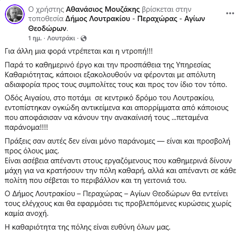 Η ανάρτηση του αντιδημάρχου καθαριότητας στο δήμο Λουτρακίου-Π-ΑΓ.Θ, Θανάση Μουζάκη: