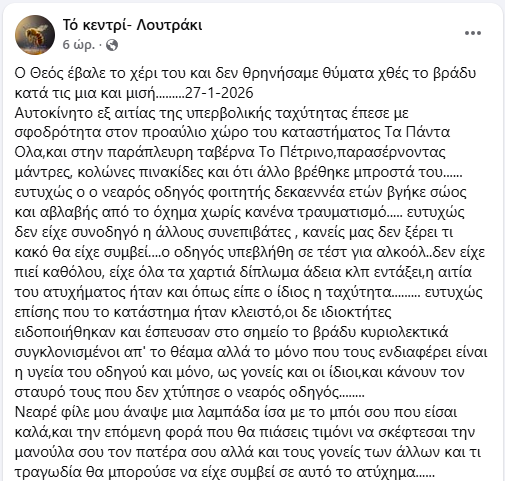 ΚοινωνικάΠΡΩΤΟΣΕΛΙΔΑ ΛΟΥΤΡΑΚΙ: …Παραλίγο τραγωδία! -Όχημα εκτός ελέγχου! -Προκλήθηκαν ζημιές σε κατάστημα και ταβέρνα! (φωτο) 27 Ιανουαρίου, 2026 FacebookTwitterPinterestWhatsApp Η ανάρτηση από το Κεντρί- Λουτράκι: