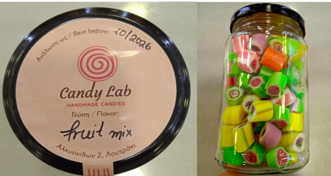 Καραμέλες «fruit mix» με ημερομηνία ανάλωσης ως 10/2026, συσκευασίας καθαρού βάρους περίπου 230g, το οποίο παράγεται και συσκευάζεται στην Ελλάδα από την «Candy Lab» που εδρεύει στο Λουτράκι Κορινθίας.