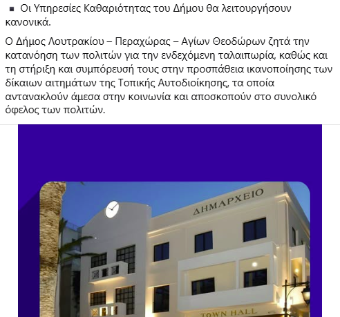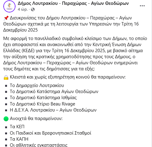 ΚοινωνικάΤοπική Αυτ/κηση ΛΟΥΤΡΑΚΙ-Π-ΑΓ: Ανακοίνωση από το δήμο -Τι θα μείνει κλειστό και τι ανοιχτό αύριο 15 Δεκεμβρίου, 2025 FacebookTwitterPinterestWhatsApp Η ανάρτηση από το δήμο Λουτρακίου-Π-ΑΓ.Θ: