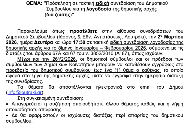 Τοπική Αυτ/κηση ΛΟΥΤΡΑΚΙ-Π-ΑΓ.Θ: Η λογοδοσία της δημοτικής αρχής 19 Φεβρουαρίου, 2026 FacebookTwitterPinterestWhatsApp Η πρόσκληση στους δημοτικούς συμβούλους: