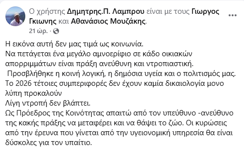 ΚοινωνικάΠΡΩΤΟΣΕΛΙΔΑΤοπική Αυτ/κηση ΛΟΥΤΡΑΚΙ-Π-ΑΓ.Θ: …Κατάντια! -Πέταξαν μεγάλο νεκρό ζώο σε κάδο απορριμμάτων!!! (φωτο) 10 Φεβρουαρίου, 2026 FacebookTwitterPinterestWhatsApp …Κατάντια! Πέταξαν μεγάλο νεκρό ζώο σε κάδο απορριμμάτων!!! …Τα σχόλια είναι περιττά! Η ανάρτηση από τον πρόεδρο της Τοπικής Κοινότητας Πισίων στο δήμο Λουτρακίου-Π-ΑΓ.Θ, Δημήτρη Λάμπρου: Κ.Ν