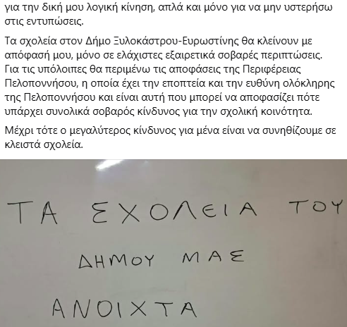 Επειδή το κακό έχει παραγίνει κάθε τόσο με το κλείσιμο των σχολείων …ακόμα και αν τυχαίνει να βρέξει λίγο παραπάνω, ο δήμαρχος Ξυλοκάστρου- Ευρωστίνης Β. Τσιώτος λέει παρακάτω ΞΕΚΑΘΑΡΑ την άποψή του!