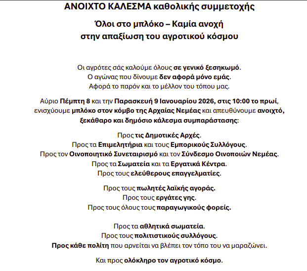 ΑγροτικάΚοινωνικά Οι αγρότες ενισχύουν το μπλόκο στον κόμβο στην Αρχαία Νεμέα 8 Ιανουαρίου, 2026 FacebookTwitterPinterestWhatsApp Η ανακοίνωση: