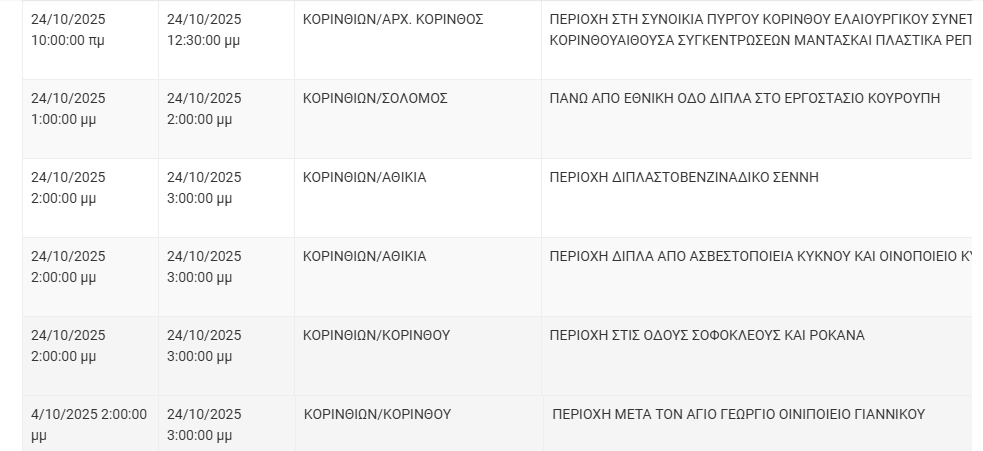 Από τον ΔΕΔΔΗΕ Κορίνθου αναφέρεται: “Λόγω εργασιών συντήρησης του Δικτύου του ΔΕΔΔΗΕ θα πραγματοποιηθεί διακοπή ηλεκτροδότησης στις παρακάτω περιοχές: