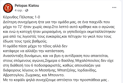 ΑθλητικάΚοινωνικάΠΡΩΤΟΣΕΛΙΔΑ Ο ΠΕΛΟΠΑΣ Κιάτου έχασε από τον ΠΑΣ Κόρινθος -ΠΕΛΟΠΑΣ: “Δεύτερη συνεχόμενη ήττα για την ομάδα μας” -Λέσχη φίλων Κόρινθος θύρα 3: “Βαριά της Μπάρτσας η φανέλα” 20 Οκτωβρίου, 2025 FacebookTwitterPinterestWhatsApp Η ανάρτηση από τον ΠΕΛΟΠΑ Κιάτου: Η ανάρτηση από την Λέσχη φίλων Κόρινθος θύρα 3: