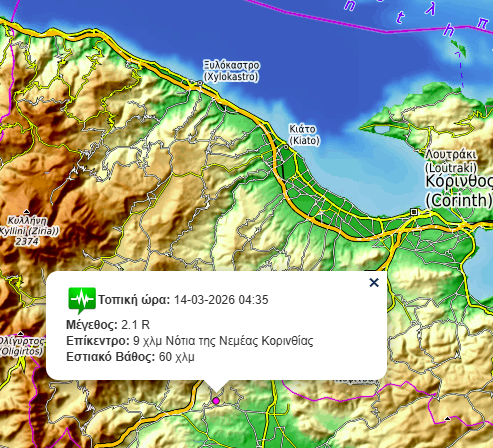 Κοινωνικά Σεισμική δόνηση κοντά στη Νεμέα (φωτο) 16 Μαρτίου, 2026 FacebookTwitterPinterestWhatsApp Ασθενής σεισμική δόνηση 2,1 Ρίχτερ σημειώθηκε το Σάββατο τα ξημερώματα κοντά στη Νεμέα Το επίκεντρο του σεισμού: Κ.Ν
