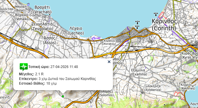 Κοινωνικά Σεισμική δόνηση κοντά στο Σολωμό Κορινθίας (φωτο) 28 Απριλίου, 2026 FacebookTwitterPinterestWhatsApp Ασθενής σεισμική δόνηση 2,1 Ρίχτερ σημειώθηκε τη Δευτέρα το πρωί κοντά στο Σολωμό Κορινθίας Το επίκεντρο του σεισμού: Κ.Ν