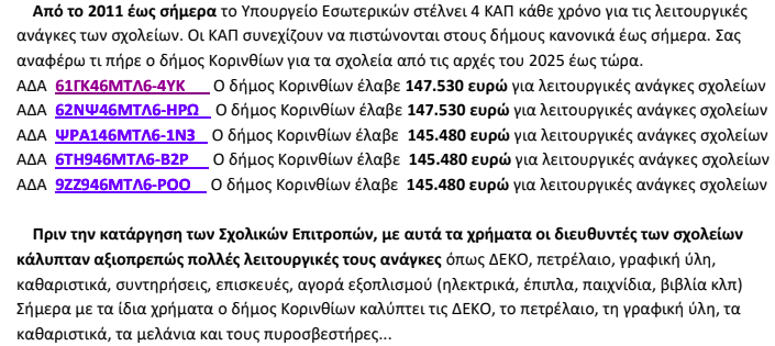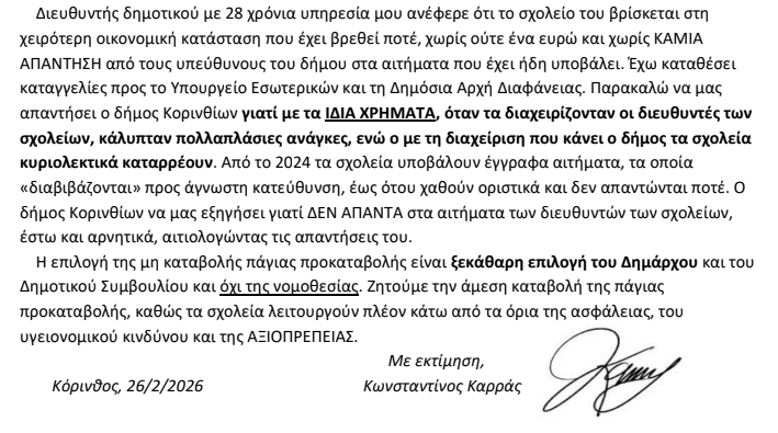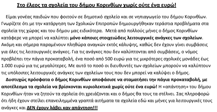 Σε επιστολή που λάβαμε από τον γονεά (που τα παιδιά του πηγαίνουν σε σχολεία της Κορίνθου) Κ. Καρρά αναφέρεται: “Κατόπιν του δελτίου τύπου του δήμου Κορινθίων σχετικά με “τη διευκόλυνση” των σχολείων στη χρηματοδότηση, κόβοντας την πάγια προκαταβολή, συμπληρωματικά σας αναφέρω ότι ο δήμος Κορινθίων έχει συμβάσεις με προμηθευτές μόλις για το 30% των πραγμάτων και των εργασιών που χρειάζονται τα σχολεία.