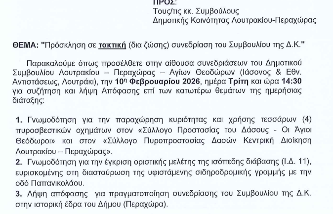 Συνεδριάζει την Τρίτη η κοινότητα Λουτρακίου- Περαχώρας
