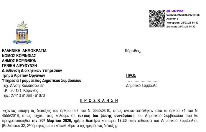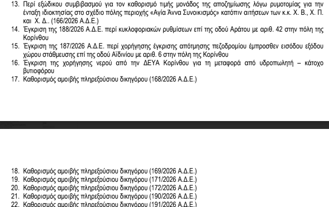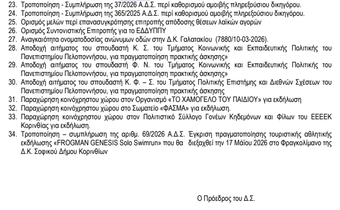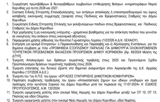 Τα 34 θέματα που θα απασχολήσουν τη Δευτέρα τη συνεδρίαση του ΔΣ Κορινθίων