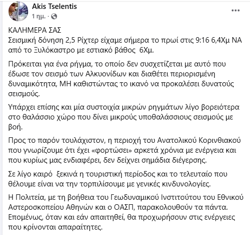 ΚοινωνικάΠΡΩΤΟΣΕΛΙΔΑ Τι ανέφερε ο Ακης Τσελέντης για το σεισμό κοντά στο Ξυλόκαστρο, το ρήγμα και την περιοχή του Ανατολικού Κορινθιακού που έχει «φορτώσει» αρκετά χρόνια με ενέργεια! -Τι συστήνει… 2 Μαρτίου, 2026 FacebookTwitterPinterestWhatsApp Η χθεσινή ανάρτηση του γνωστού σεισμολόγου Άκη Τσελέντη: