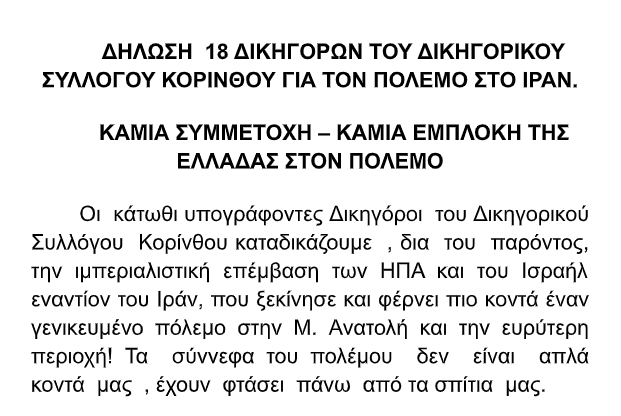 Κοινωνικά Τι απαιτούν 18 δικηγόροι του δικηγορικού συλλόγου Κορίνθου! -Τα ονόματα και των 18 που υπογράφουν την επιστολή 4 Μαρτίου, 2026 FacebookTwitterPinterestWhatsApp Η δήλωση των 18 δικηγόρων του δικηγορικού συλλόγου Κορίνθου: