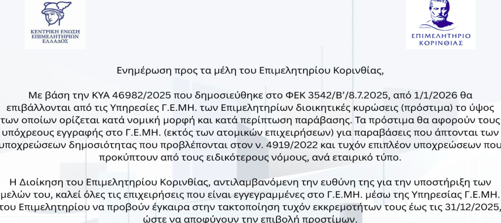 Κοινωνικά Το επιμελητήριο Κορινθίας ενημερώνει τα μέλη του για τα πρόστιμα! 9 Δεκεμβρίου, 2025 FacebookTwitterPinterestWhatsApp Η ανακοίνωση από το επιμελητήριο Κορινθίας:
