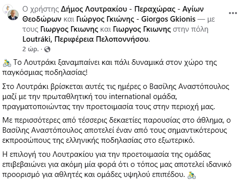 ΑθλητικάΚοινωνικάΤοπική Αυτ/κηση Το Λουτράκι ξαναμπαίνει δυναμικά στο χώρο της παγκόσμιας ποδηλασίας! (βίντεο) 11 Μαρτίου, 2026 FacebookTwitterPinterestWhatsApp Η ανάρτηση από τον δήμαρχο Λουτρακίου-Π-ΑΓ, Γ.Γκιώνη: