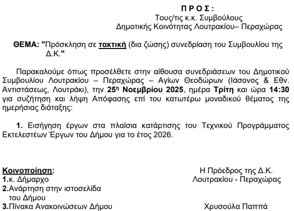 Το μοναδικό θέμα που θα απασχολήσει την Τρίτη τη συνεδρίαση στην κοινότητα Λουτρακίου- Περαχώρας