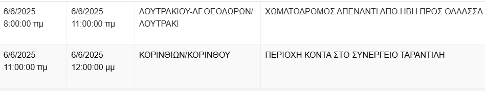 Από τον ΔΕΔΔΗΕ Κορίνθου αναφέρεται: “Λόγω εργασιών συντήρησης του Δικτύου του ΔΕΔΔΗΕ θα πραγματοποιηθεί διακοπή ηλεκτροδότησης στις παρακάτω περιοχές: