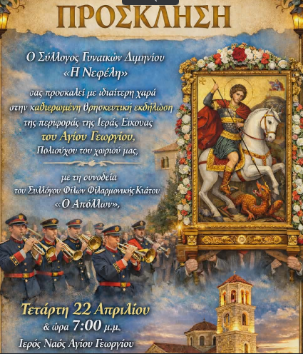 Κοινωνικά ΔΙΜΗΝΙΟ: Περιφορά της εικόνας του ΑΓ. Γεωργίου 21 Απριλίου, 2026 FacebookTwitterPinterestWhatsApp Η πρόσκληση:
